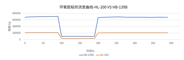The same proportion of hydrophobic fumed silica HB-139B and HL-200 was added to epoxy wind power adhesives, and a rotational rheometer was used to test their viscosity and thixotropy. Technicians found that at the same addition level, the initial viscosity of the epoxy wind power adhesive with HB-139B can reach approximately 700,000 cp, while that of HL-200 is 200,000 cp, about 3.5 times higher. High viscosity can establish a three-dimensional network structure in epoxy adhesives faster and more effectively, which is crucial for inhibiting filler settlement and maintaining storage stability.