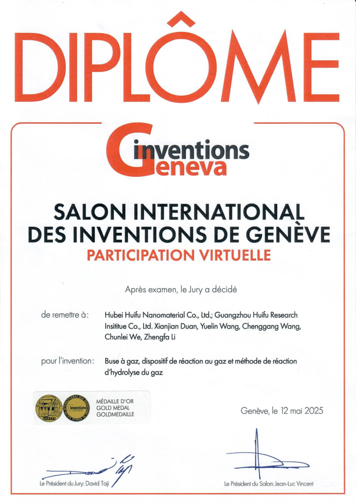 Recently, the 50th edition of the Salon International Des Inventions De Geneve concluded successfully in Geneva, Switzerland. HUBEI HUIFU NANOMATERIAL CO., LTD. stood out among thousands of innovative inventions from over 40 countries with two core patented technologies: “Gas Nozzle, Gas Reaction Equipment, and Gas Hydrolysis Reaction Method” and “A Combination Processing Device and Method for Surface Modification via Silicon Pyrolysis”.
